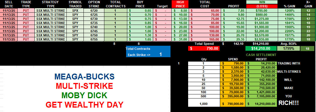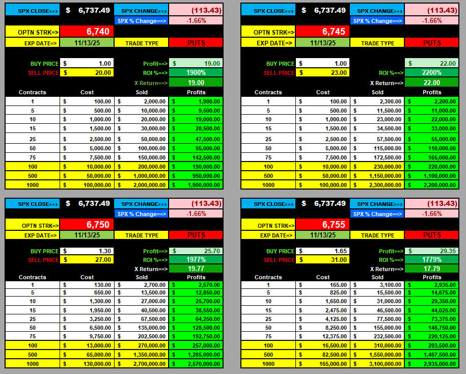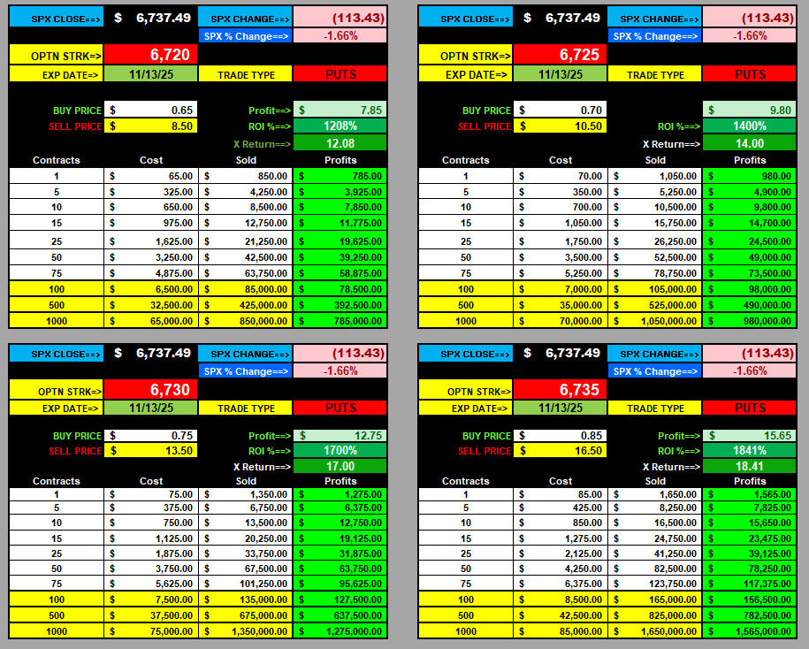 Another crazy volatility day, with PUTS making Moby Dick ProfitsUP! As usually happens, markets rose in anticipation of the government shutdown ending, and when Trump finally signed the bill, markets dumped—buy the rumor and sell the news! The move was definitely predictable with the SGB zones on the daily chart (as I have pointed out for over a decade), and once again, they proved to be the most accurate and reliable indication of where price action WILL GO! Now we have the 6666.66 support, and if that gets taken out, the next SGB zone is down at 6555; otherwise, the upside target is back to those SGB zones now that all the gaps have been filled.