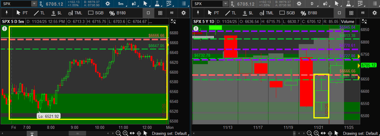 OPEN - 6555.77 / HI - 6660.05 / LO - 6521.92 / CLOSE - 6602.99 +64.23 +0.98% — Days Range: 138.13