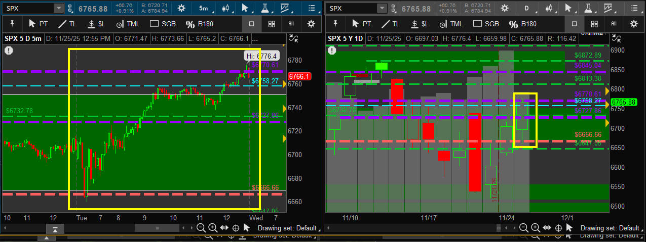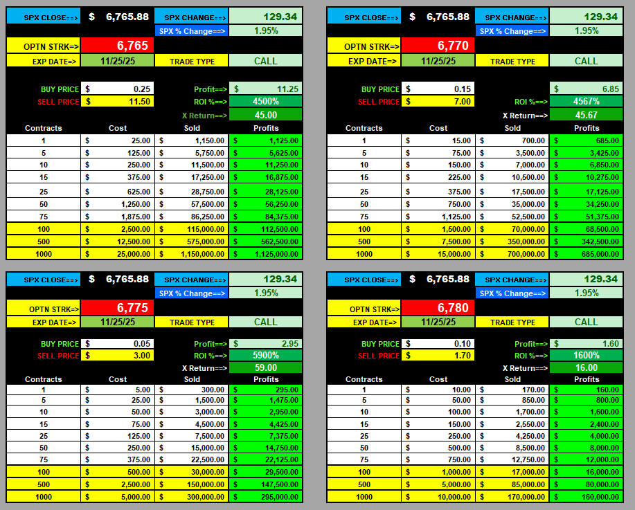 Will the SPX hit 6900 tomrorow or will it take Friday. Either way that is the target for CALL strikes and 6700 for PUTS but overweighting CALLS is the move unless we get a gap-n-crap on the 15-minute ORB tomorrow. Then I will be looking for a test and/or close around 6750.