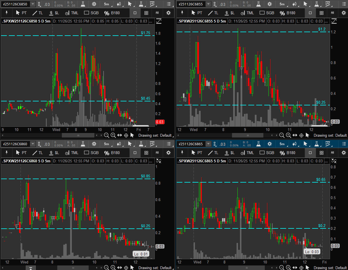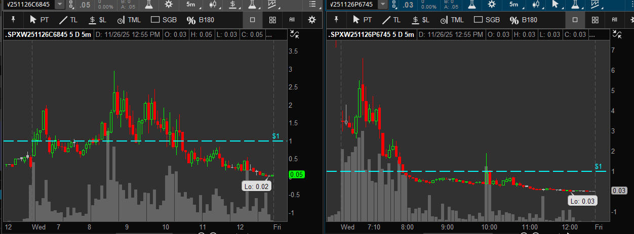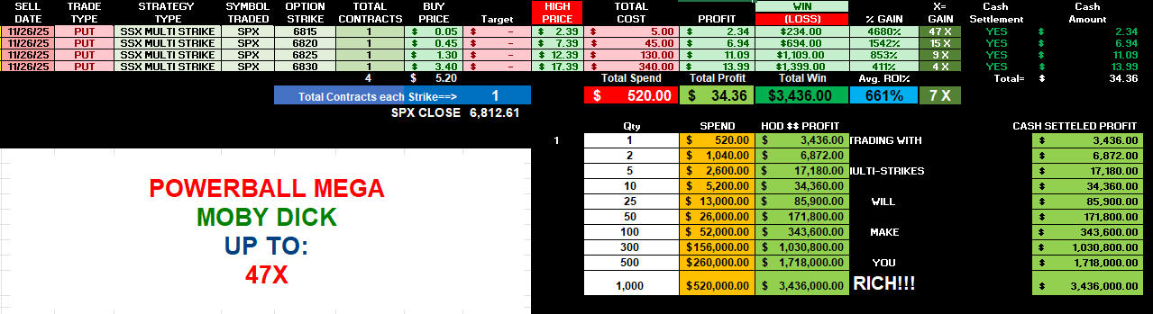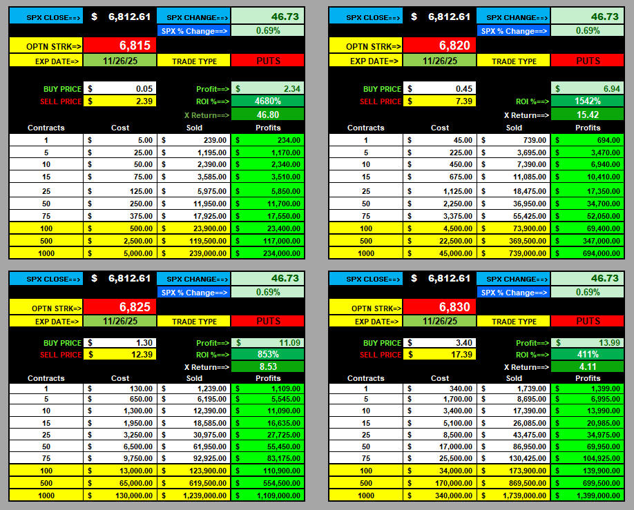 I will be watching the action around 6830 - 6855 Friday and if it cannot be taken out, I will be looking for an even bigger move in the afternoon session as this will also be the last trading day of November too. Now if it does gap up Friday (likely under current momentum) the SPX will most likely make a play for the SGB zone and may even jam up to "69"00 ;-) before the bit screw-job comes on Monday December 1st. Always a roller coaster ride trading this sucker, but if you trade both CALLS and PUTS my data PROVES you an achieve ANY FINANCIAL level you want in a few months or sooner!