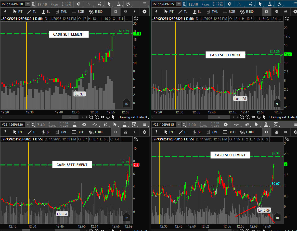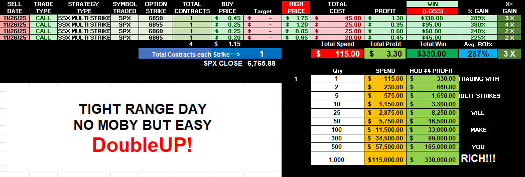 The SPX takes out the entire multi-day sell-week from the last SGB and holds over 6800 ahead of the Thanksgiving day Holiday. Tomorrow the markets will be closed and on Friday trading for only a half day. The $1 Formula was in a tight range only making a DoubleUP! but the EOD action was the Moby Dick opportunities when the SPX took a sharp profit taking dump in final 15 minutes of trading as news hit regarding a tragic ambush/murder of two national guard soldiers that happened near the White House.