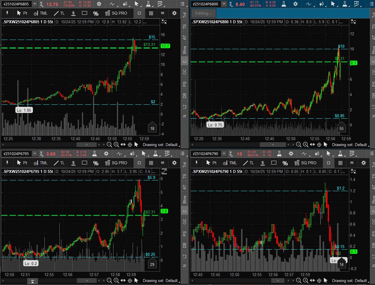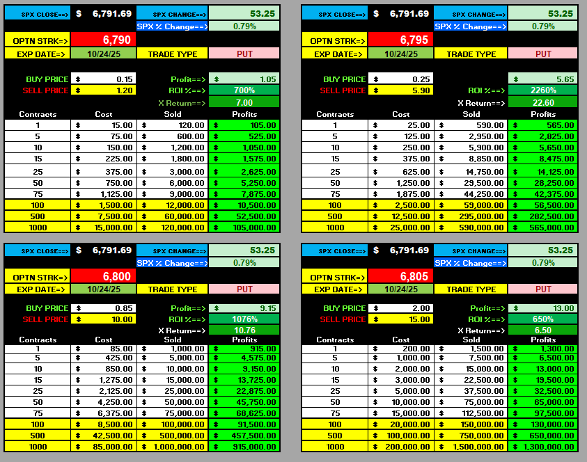 So, the discipline is to always set profit targets at 2x 200%–3X 300% ROI on single lots until you can compound, then always sell half your loads at 3X and layer the rest up to 10X, leaving some on for those parabolic days like you will see below on the PUTS and collect some extra ROI cash settlement!