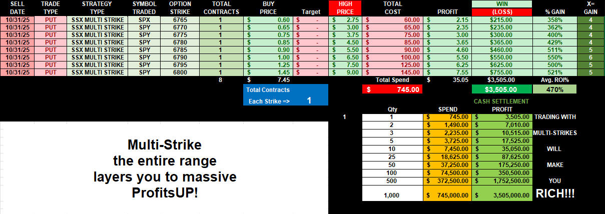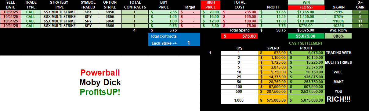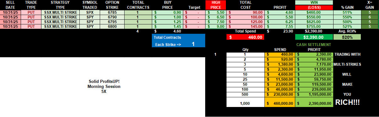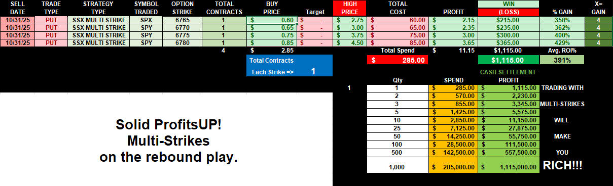 Crazy whipsaw day for Halloween trading and quarter end rebalancing. Puts at the open exploded in ProfitsUP! then switched to CALLS at lunch session for ROCKET ProfitsUP! then load the boat for EOD PUTS and GET RICH CASH SETTLEMENT!!!!