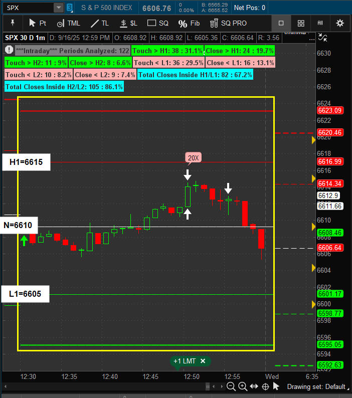 12:30 PM PST - Quant Pivot lines: Neutral =6610 H1= 6615 L1= 6605 — CLOSE - 6606.76 -8.52 -0.13%