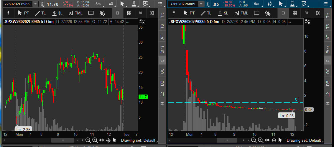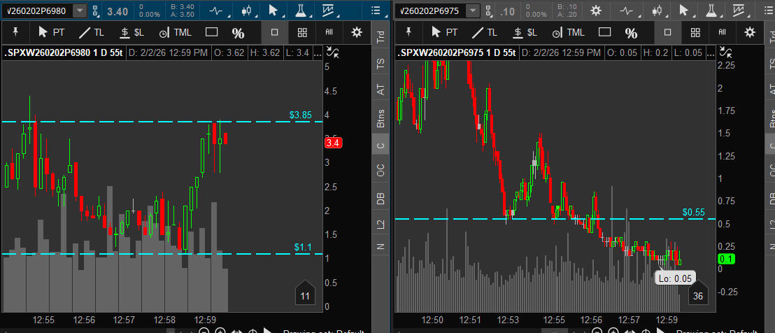 First day of Feb and SPX takes off higher all day stopping at the top of the SGB zone and 8 points short of 7,000. A break above it will be a contiuation for the Bulls and a pullback will be very bearish. I will be looking for the SGB zone to hold and targeting the "55" strikes on both CALLS and PUTS.