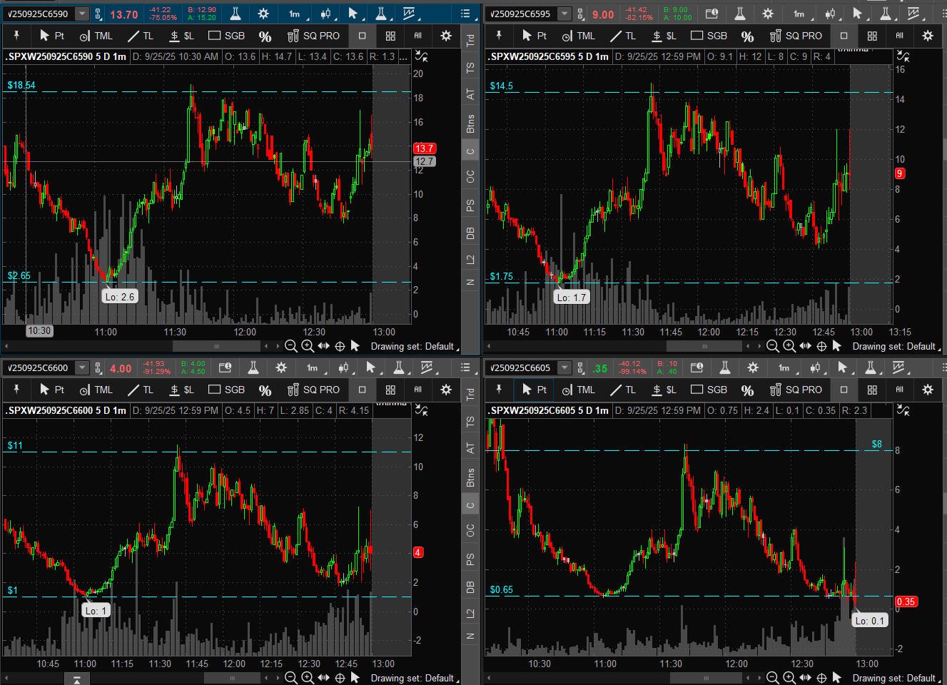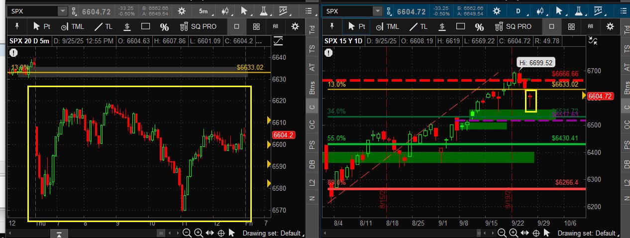 So long as SPX remains under 6666.66 my bias is PUTS on rips and CALLS on 50 plus point dips with special attention to intraday V bottoms and daily SGB zones. The close today was another dragonfly Doji like the previous one basically exactly matching so there is definitely a BIG MOVE coming any day now. Next week is month/quarter end and then "crash" month October surprise begins so having event horizon PUTS in place at the SGB zones is where I will be and Spreads too.