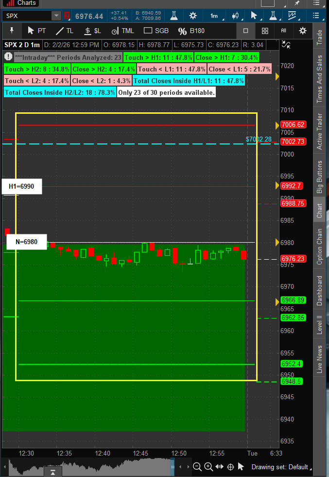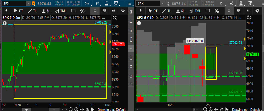 February 02, 2026 SPX - OPEN - 6916.64 / HI - 6991.92 / LO - 6914.34 / CLOSE - 6976.44 +37.41 +0.54% — Days Range: 77.58