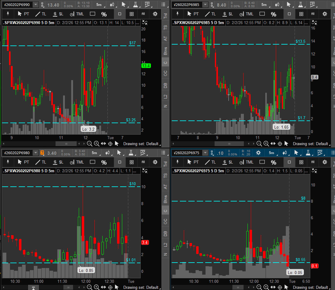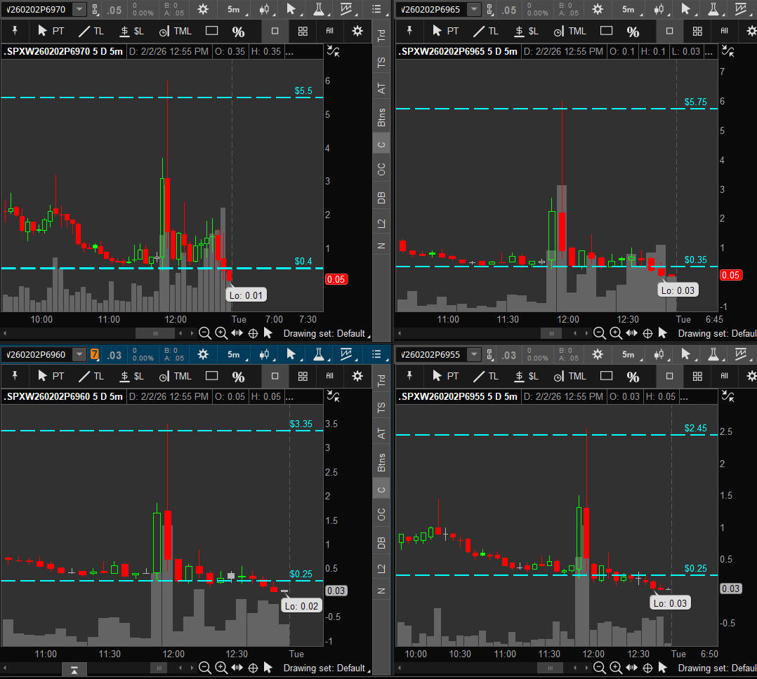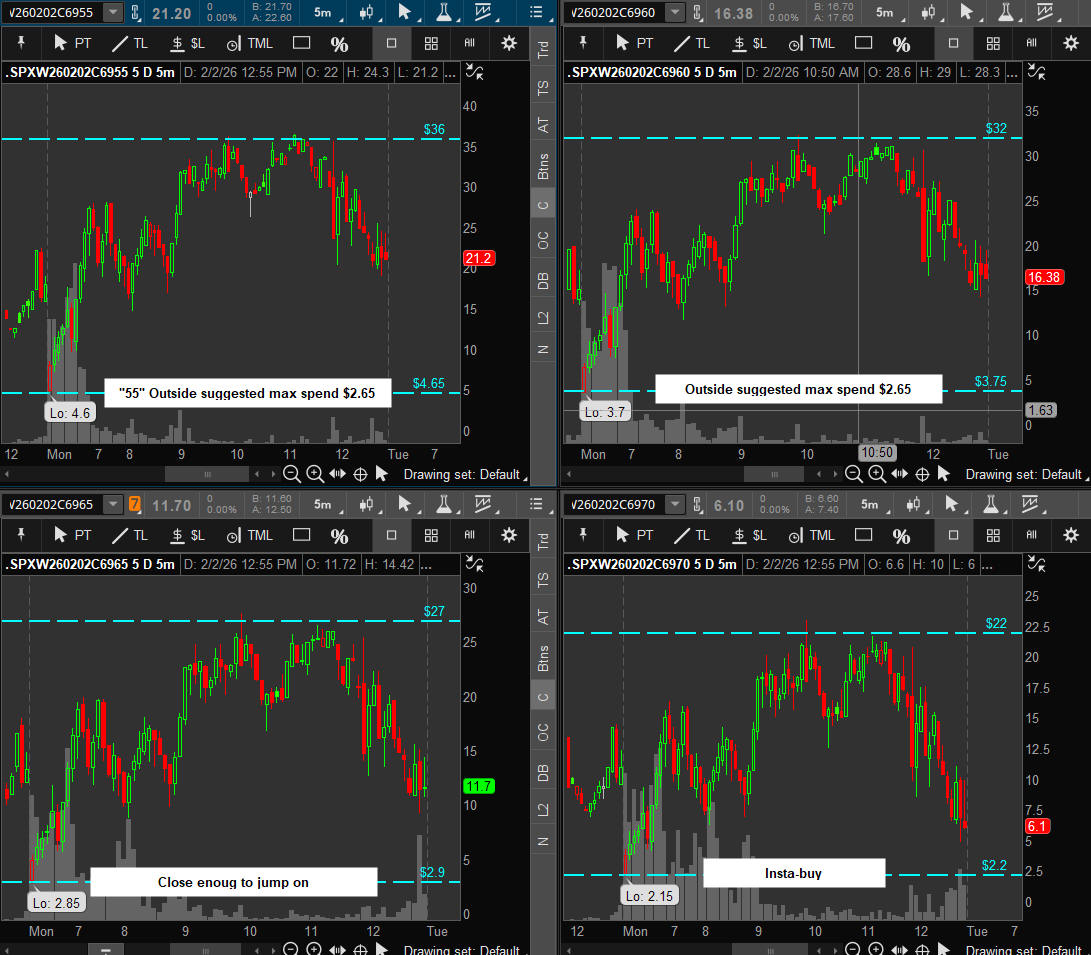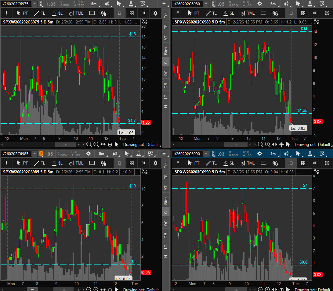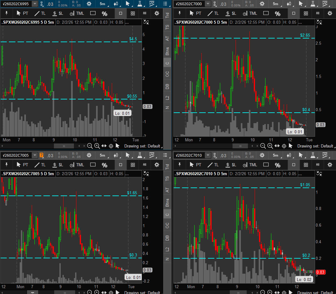 First day of Feb and SPX takes off higher all day stopping at the top of the SGB zone and 8 points short of 7,000. A break above it will be a contiuation for the Bulls and a pullback will be very bearish. I will be looking for the SGB zone to hold and targeting the "55" strikes on both CALLS and PUTS.