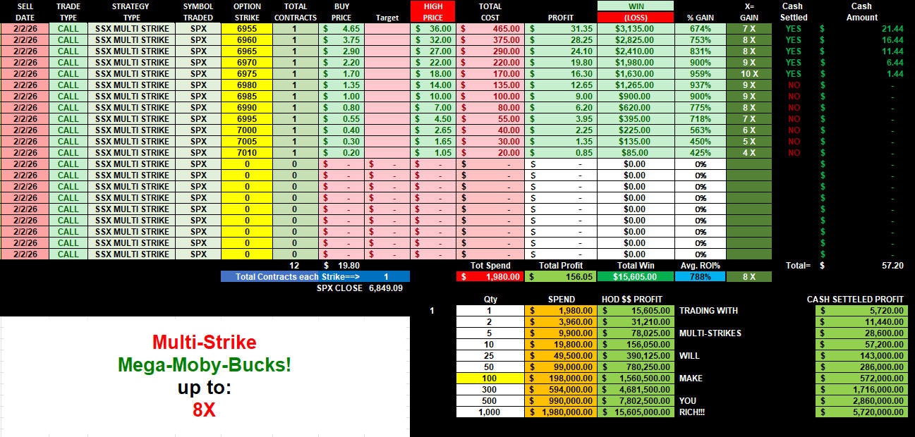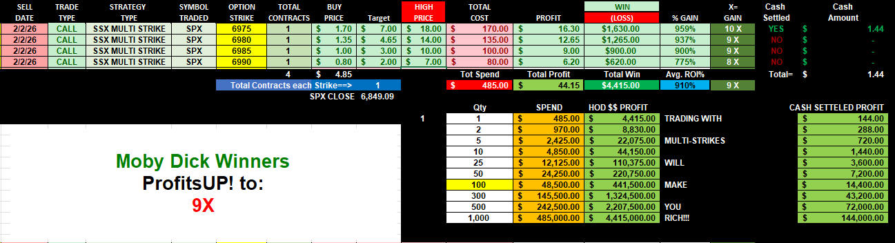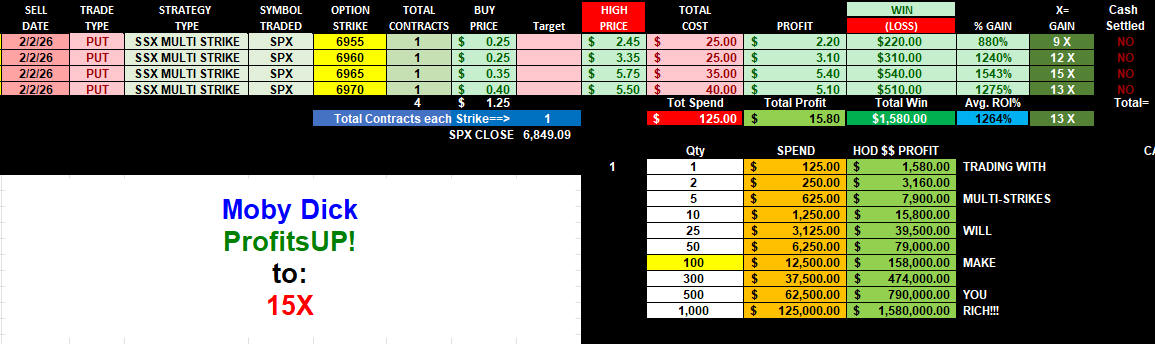 All these strikes easily fit the $1 Formula buy ranges and went Moby Dick Parabolic: