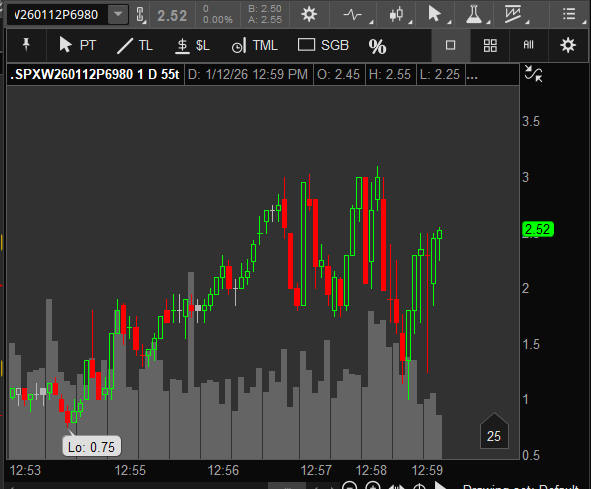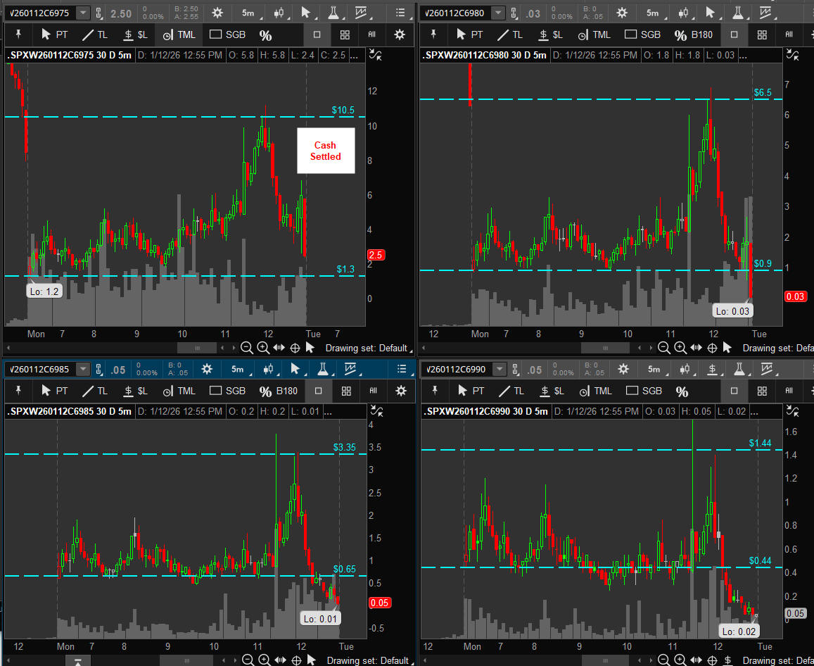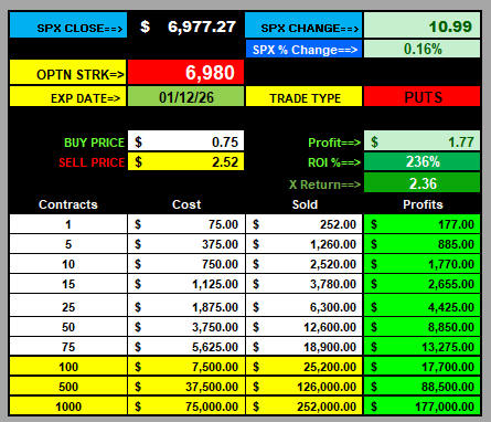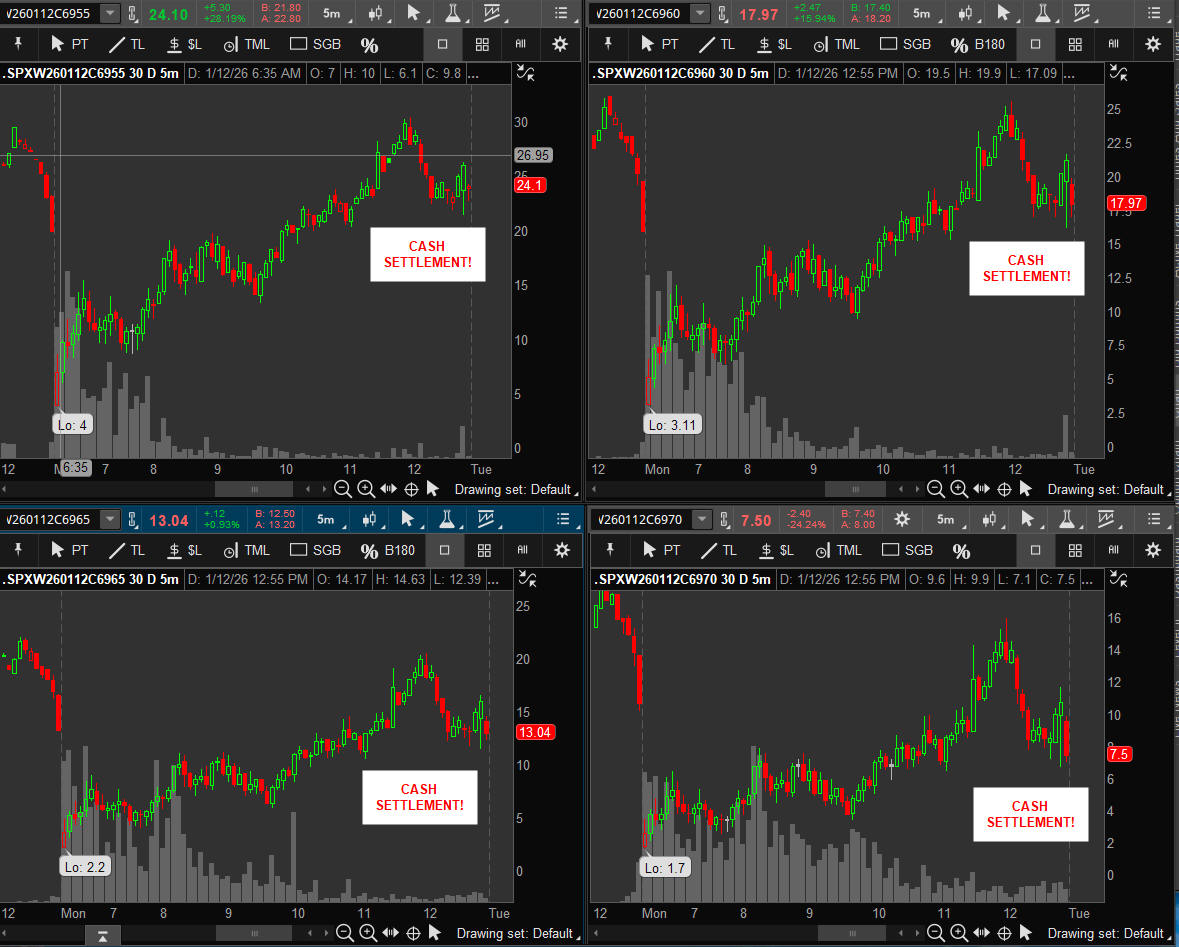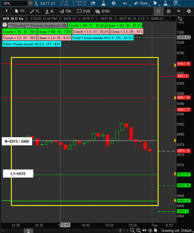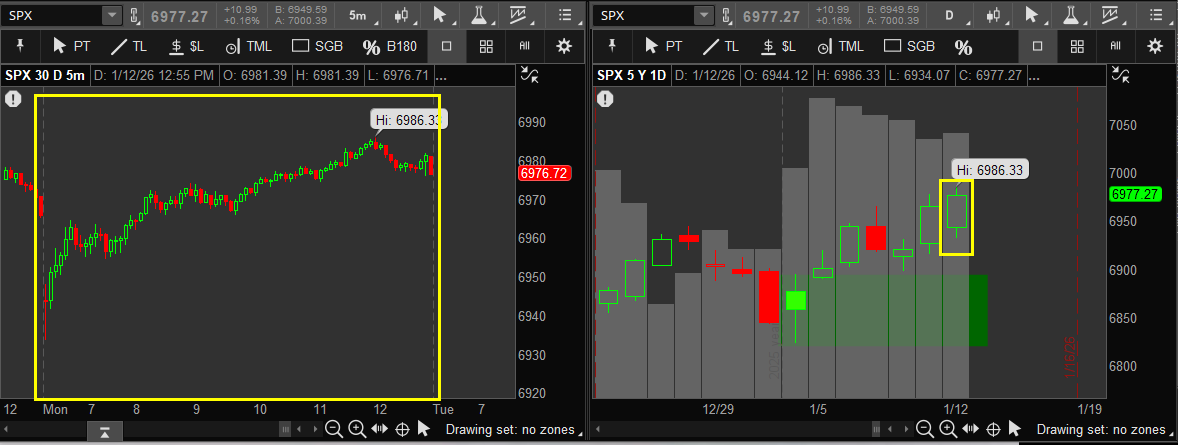 January 12, 2026 SPX - OPEN - 6944.12 / HI - 6986.33 / LO - 6934.07 / CLOSE - 6977.27 +10.99 +0.16% — Days Range: 52.26