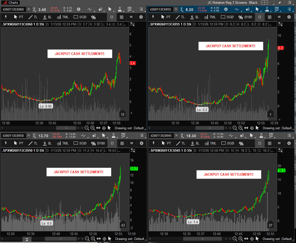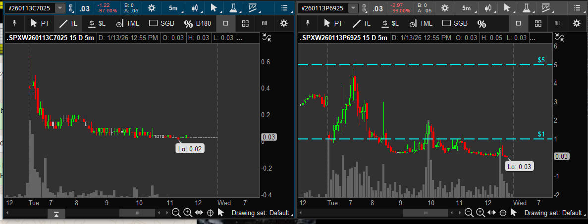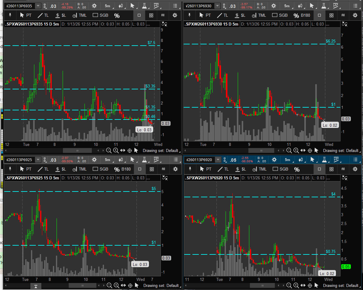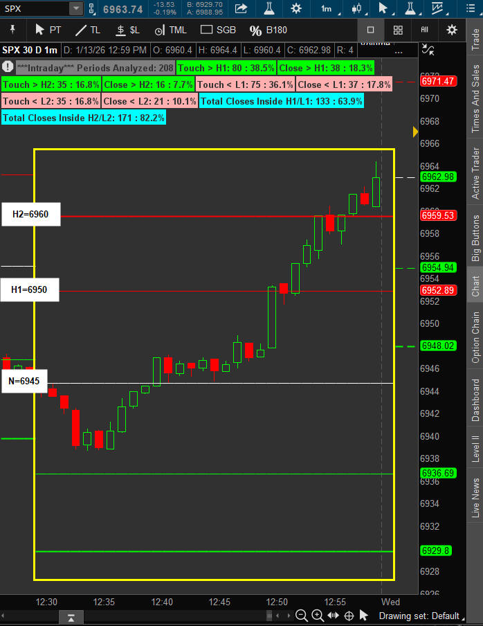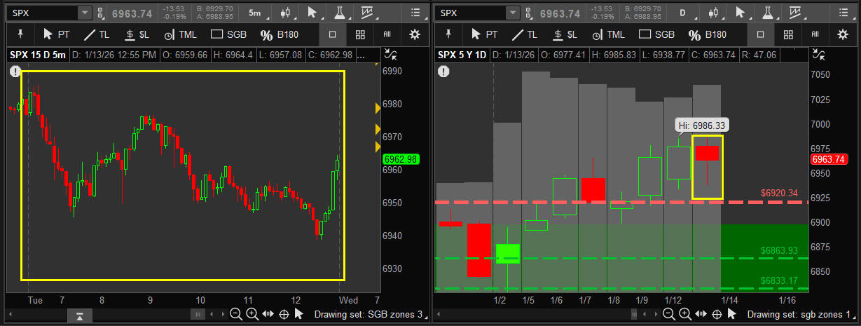 January 13, 2026 SPX - OPEN - 6977.41 / HI - 6985.83 / LO - 6938.77 / CLOSE - 6963.74 -13.53 -0.19% — Days Range: 47.06