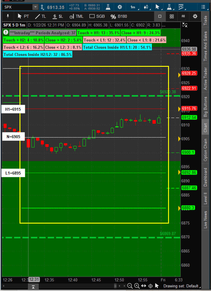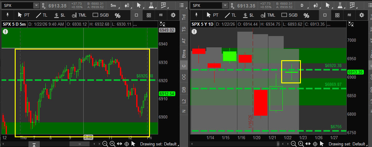 January 22, 2026 SPX - OPEN - 6914.44 / HI - 6934.75 / LO - 6893.62 / CLOSE - 6913.35 +37.73 +0.16% — Days Range: 41.13