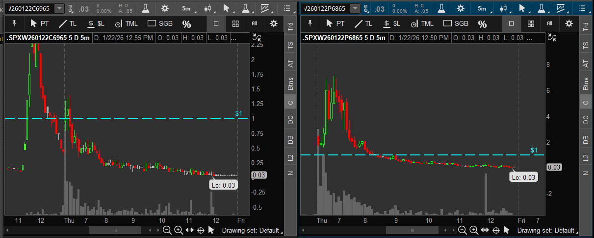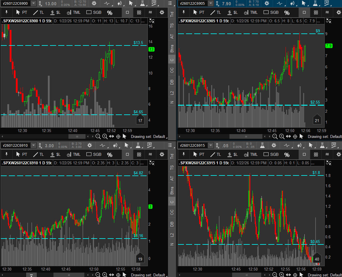 After the massive moves from yesterday, the market was in a tight range between SGB zones and the options were inflated with IV so the ROI's were minimual. Trump returns to US tonight so I anticiapte some tweets and/or comments on the Greenland "deal" and othere potential market moving comments. Earnings season has begun and if the companies show weakness we should see some continuation selling going forward. I am watching for the reaction at the SGB zone around 6955 and with tonights DOJI I expect some bigger moves any day now.