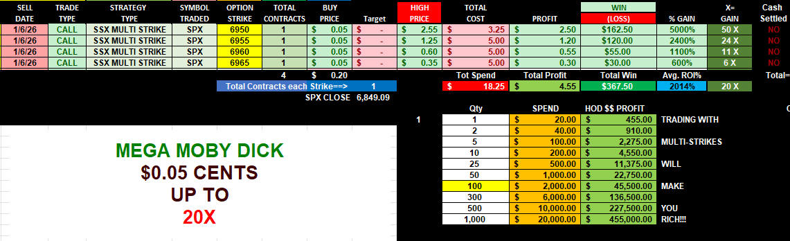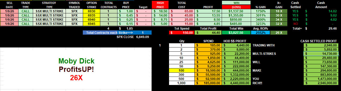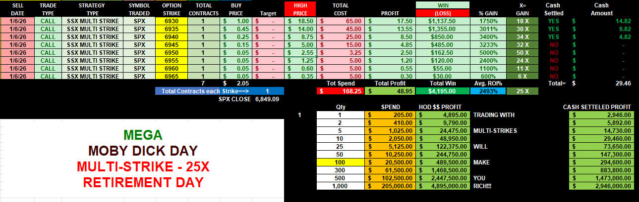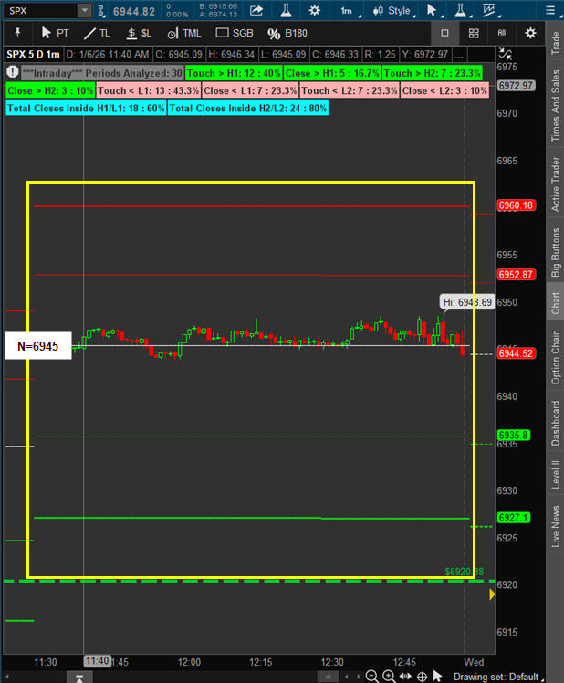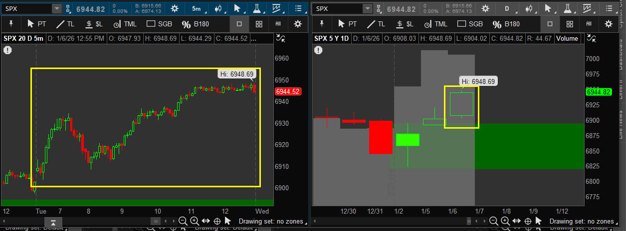 January 06, 2026 SPX - OPEN - 6908.03 / HI - 6948.69 / LO - 6904.02 / CLOSE - 6944.82 +42.77 +0.62% — Days Range: 44.67