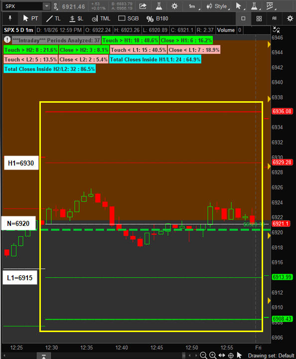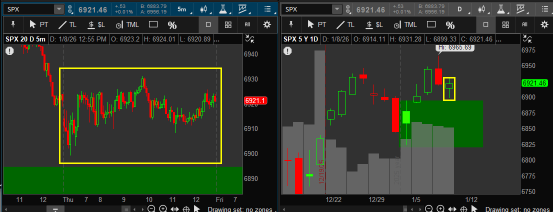 January 8, 2026 SPX - OPEN - 6914.44 / HI - 6931.28/ LO - 6899.33 / CLOSE - 6921.46 +0.53 +0.01% — Days Range: 31.95