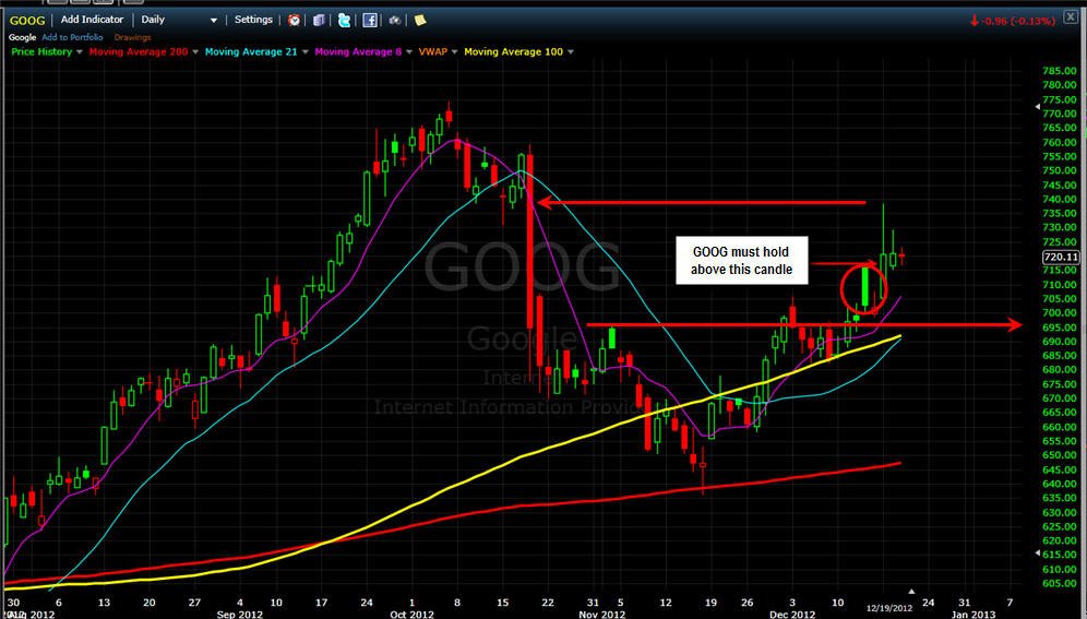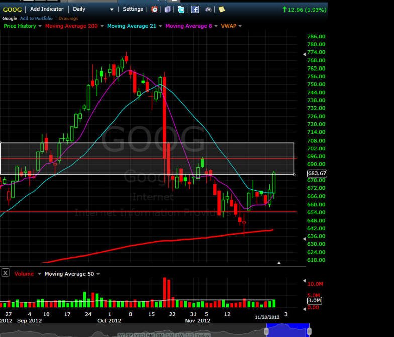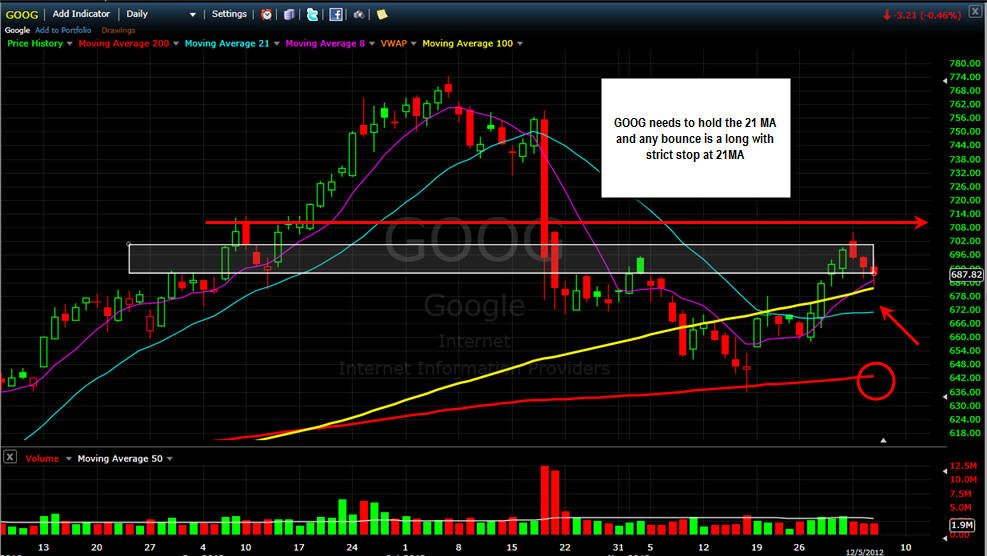================================================================================================== 12/5/12 - Looking for a play on GOOG and with today's meltdown with AAPL GOOG actually held up pretty well. I would have liked to see a positive close, but so long as it stays above the 21MA on the daily chart I am bullish. Any rally in the market is a call play for me.