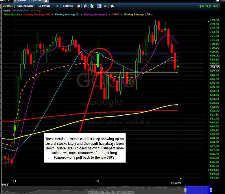 As for the rest of the week, I am bullish so long as GOOG holds over the solid green candle from last Thursday. The best case scenario is we get a little sell off tomorrow so the Calls get really cheap and we can take a Lotto Play for a hopeful 12/21/12 surprise we are still here rally.