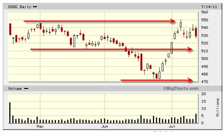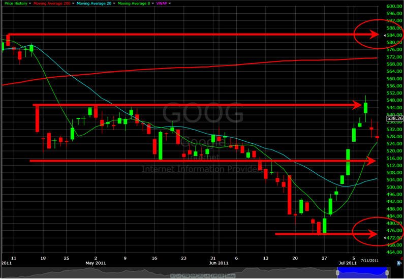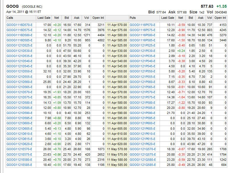 4/11/11 - It's time to straddle a lotto play on GOOG. Options expiration is Friday and GOOG has been on quite a nice run for the past couple of weeks and now it's selling off a little bit ahead of upcoming earnings. With all this buying activity, I suspect they will meet or beat earnings on Friday. I am going to do a straddle and I am sure I will be nicely rewarded on this awesome stock!