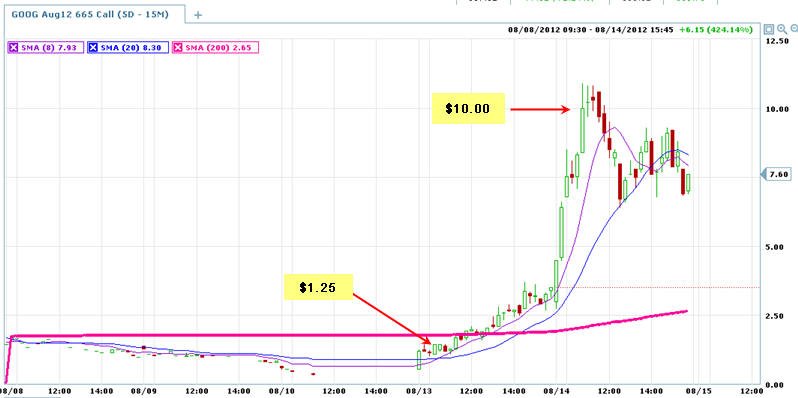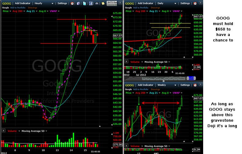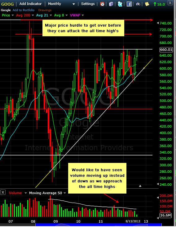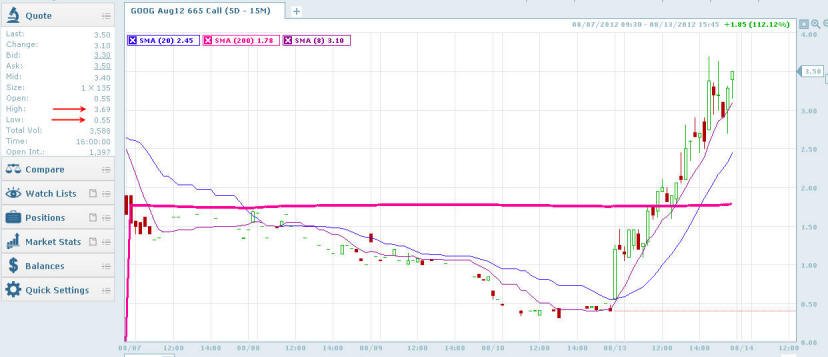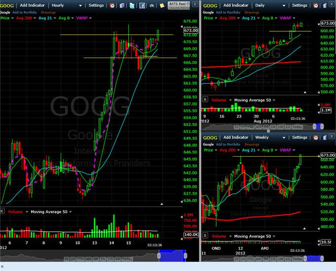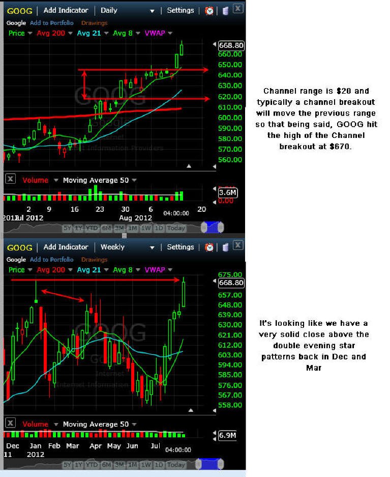 =========================================================================== 8/14/12 - As predicted, Google did hold yesterdays move and now appears ready to make an extended move higher. Here is what the options I posted yesterday did today. GOOG needs to move about 12% more to put in a new all-time-high so any close above $670 and the race is on. I will be looking for a Lotto play on Wed and Thurs so stay tuned and lets see if we can get a Friday rally and nice profit.