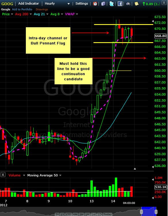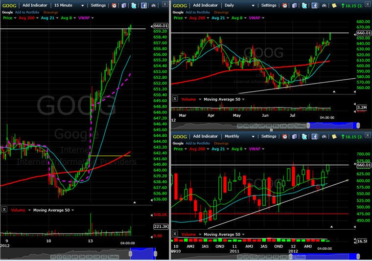 8/13/12 - Looking over today's action makes for a good case that GOOG could take out its all time high of $747 soon. It has been a very long time coming and with all the enthusiasm in "tech" stocks these days, I certainly can see GOOG making a run for the higher ground. Today, was a very good day to be long this stock, so I am looking for an opportunity pull back before I get in with a full position. If the stock does gap up tomorrow, I will buy a small position on any dip that holds above the open. If GOOG does get a close over $670 on stronger volume than today, the race is on to take out the all time high!! So, what moved the stock today? In my opinion, it was the news they were restructuring their purchase of Motorola mobility, oh, and an upgrade by Morgan Stanley...yup, that's the ticket all right—I will be looking for the next Lotto Ticket Trade on this one! Google plans to cut jobs (bummer) by restructuring the company so they can expand their Android offerings. This will increase market share in the long run, and that means more profits! Of course, more profits means higher stock prices; and analysts love to trade high flying stocks on a multiple of future earnings —tomorrow will be a good confirmation day for higher ground. Options are very expensive on this stock, so you have to have a strong tolerance to loss, because this stock has a lot of volatility premium packed into the longer term option prices; however, if you are able to sit and watch the charts intra-day, then you can get great trading opportunities like this one: