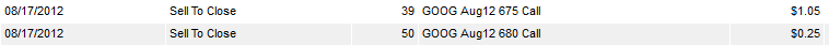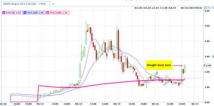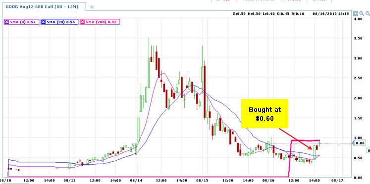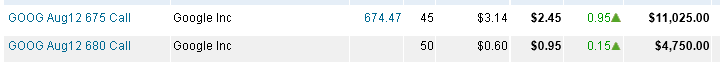 ================================================================================= 8/15/12 - Google is holding ground today which is a good sing for a move higher by Friday. I will be watching tomorrow for my next Lotto play entry. If GOOG opens higher than $675 tomorrow, then I will look at the 685 calls.