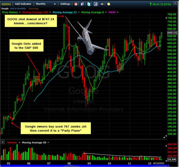 On a side note, I remember the last time GOOG was making it's first all time high, the owners of the company were riding high on success and exuberance, so they bought a 767 Jumbo jet! It was widely reported they remodeled it into a mile high party plane rather than a genuine corporate business tool. After they bought that plane, the company was added to the S&P 500 a year later; and then then the real control over the stocks price started.